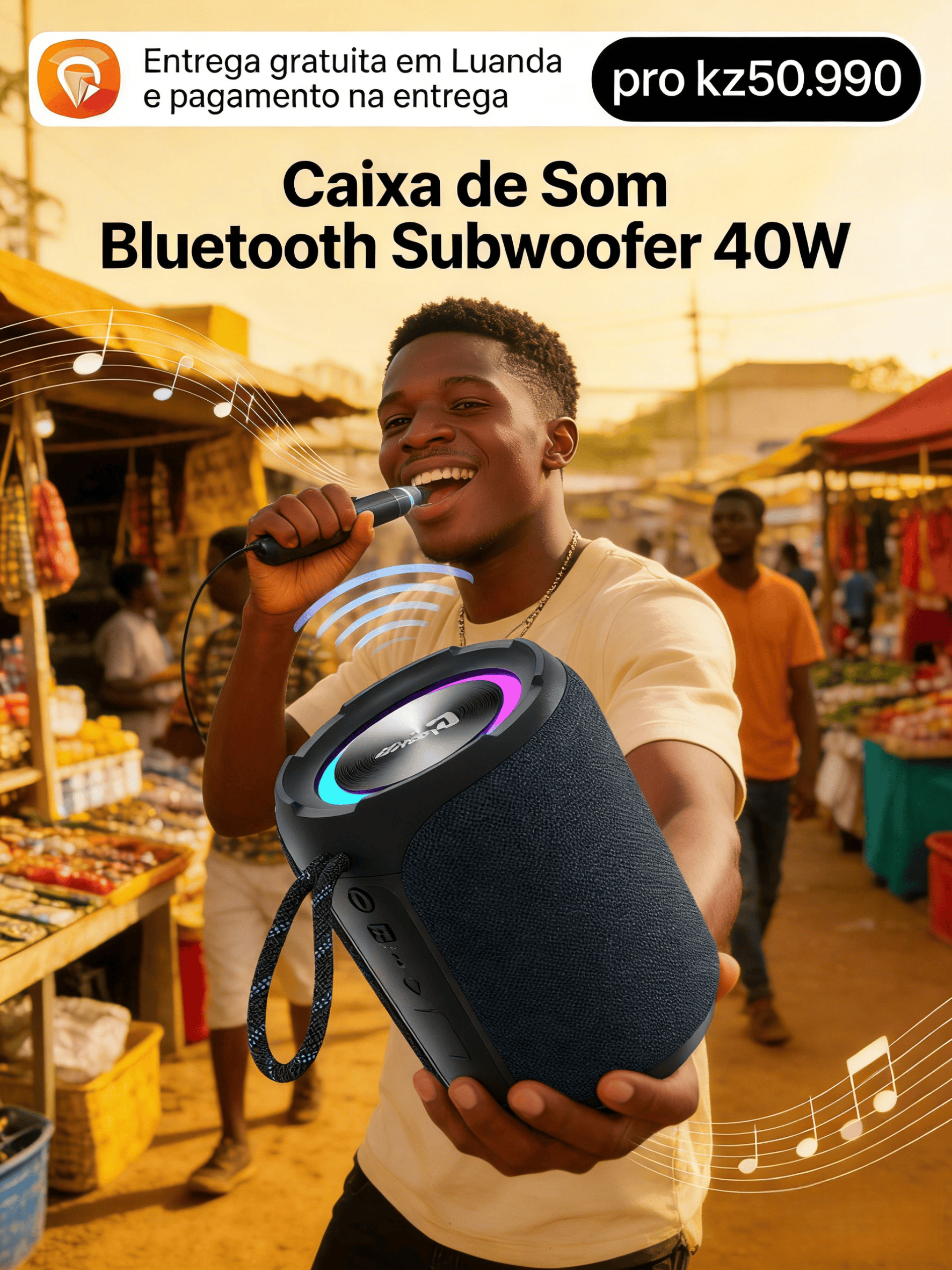 这款40瓦音箱是安哥拉充满活力生活的理想配饰——无论你是在街头市场卖货,还是在海滩与朋友聚会,或是在家中享受片刻。凭借强劲的音效和充满活力的低音,它能为任何环境注入能量(非常适合吸引集市顾客!)。它的防水(IPX7)和便携设计配有连接线,让你可以随时携带,无需担心细雨或跌倒。此外,长续航(长达10小时)适应了本地长时间户外活动的日常习惯。