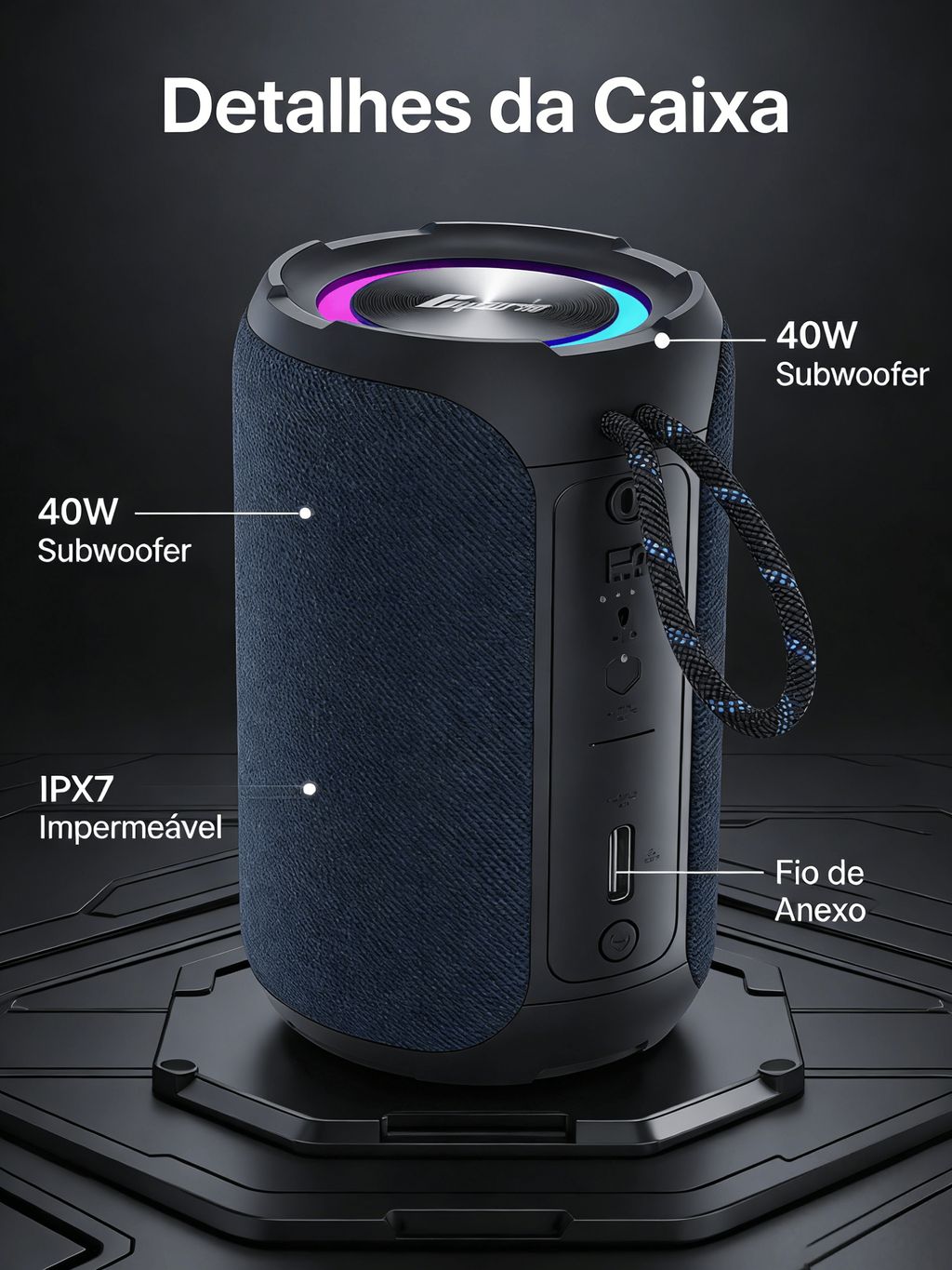 Caixa de Som Bluetooth Portátil Subwoofer 40W Impermeável para Exterior e Mesa