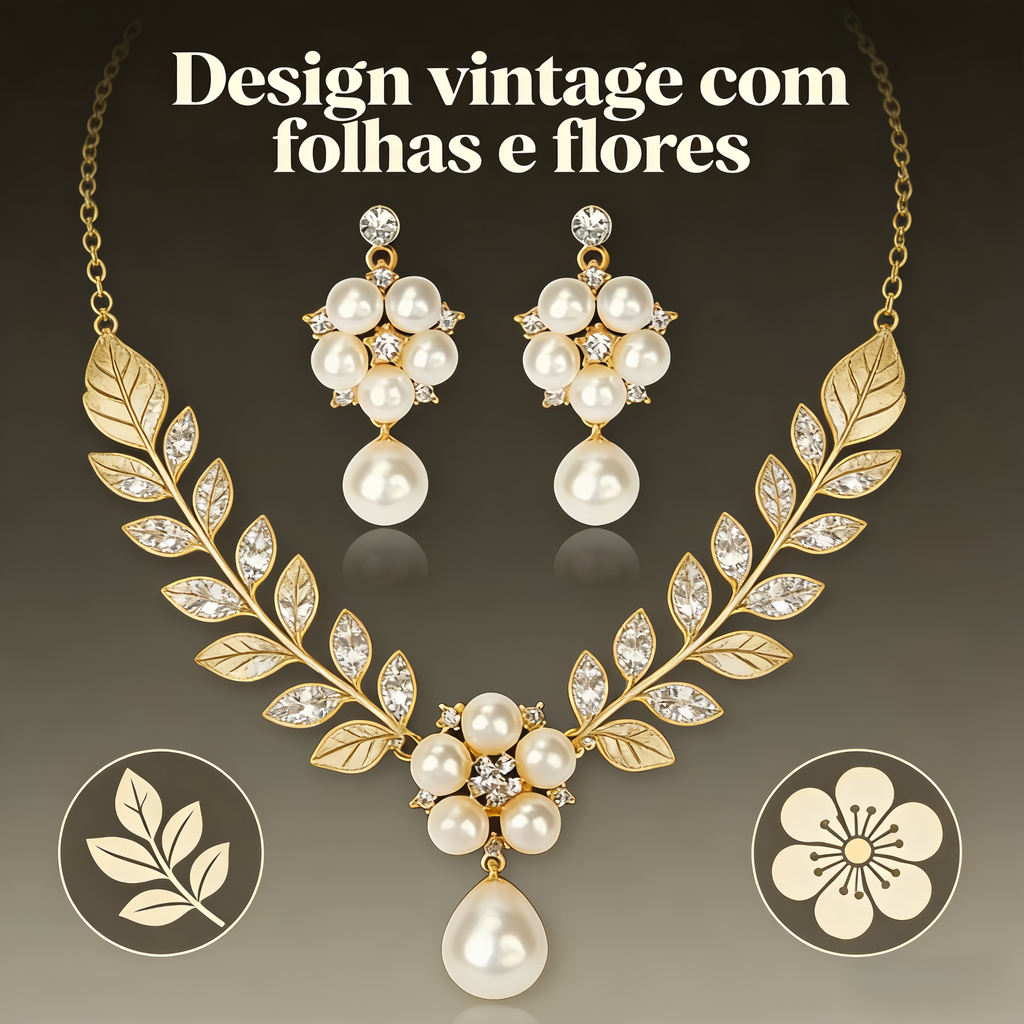 Design: Formato de folha e flor (estilo vintage), colar ajustável (se adapta a qualquer tamanho de pescoço), brincos com gancho seguro (não cai facilmente, mesmo em movimentos).