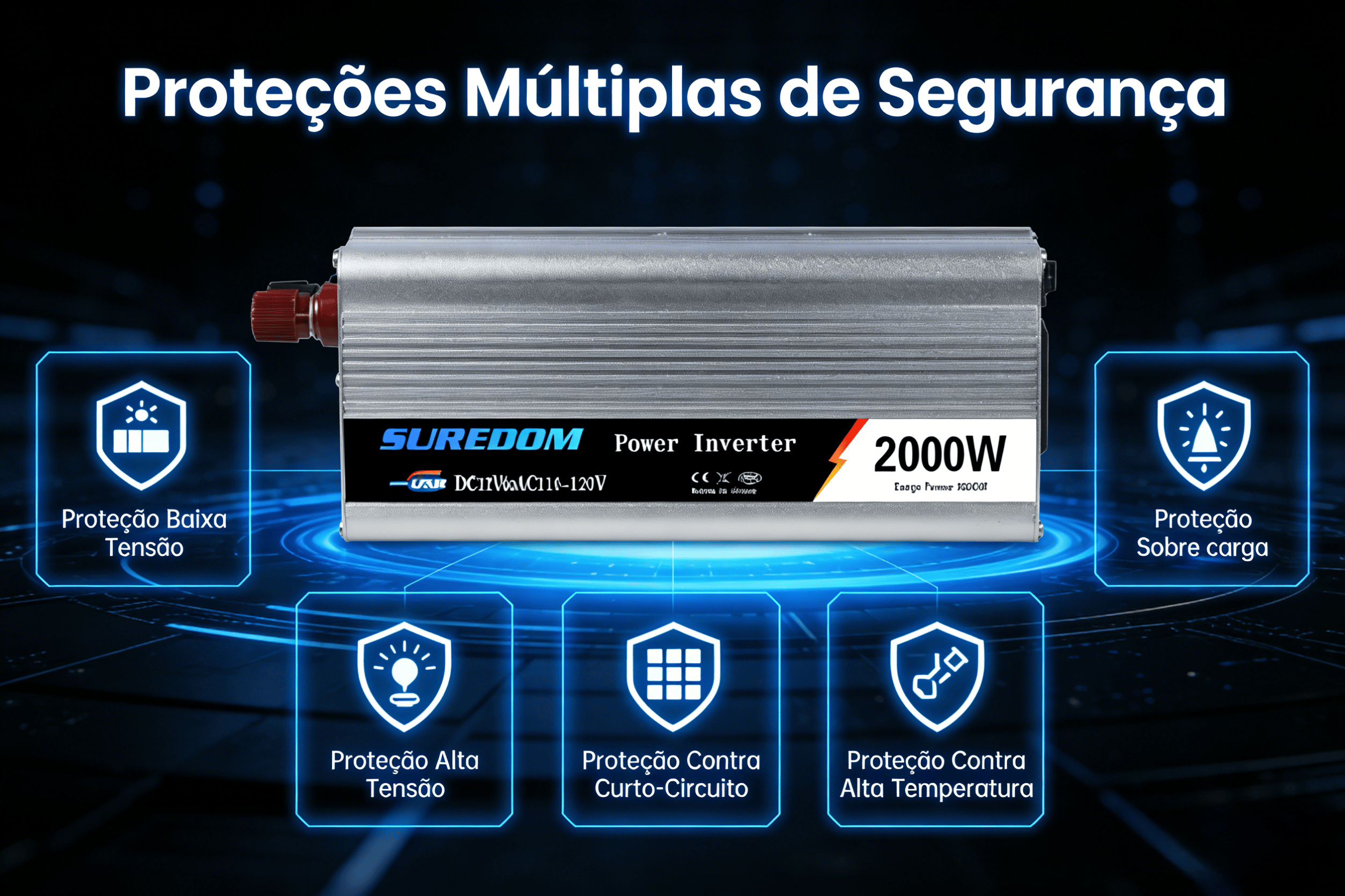 Proteções Múltiplas de SegurançaConta com proteção contra baixa tensão, alta tensão, superaquecimento, sobrecarga e curto-circuito — previne danos ao inversor e aos aparelhos, garantindo segurança mesmo em ambientes de uso intensivo (como mercados de rua).