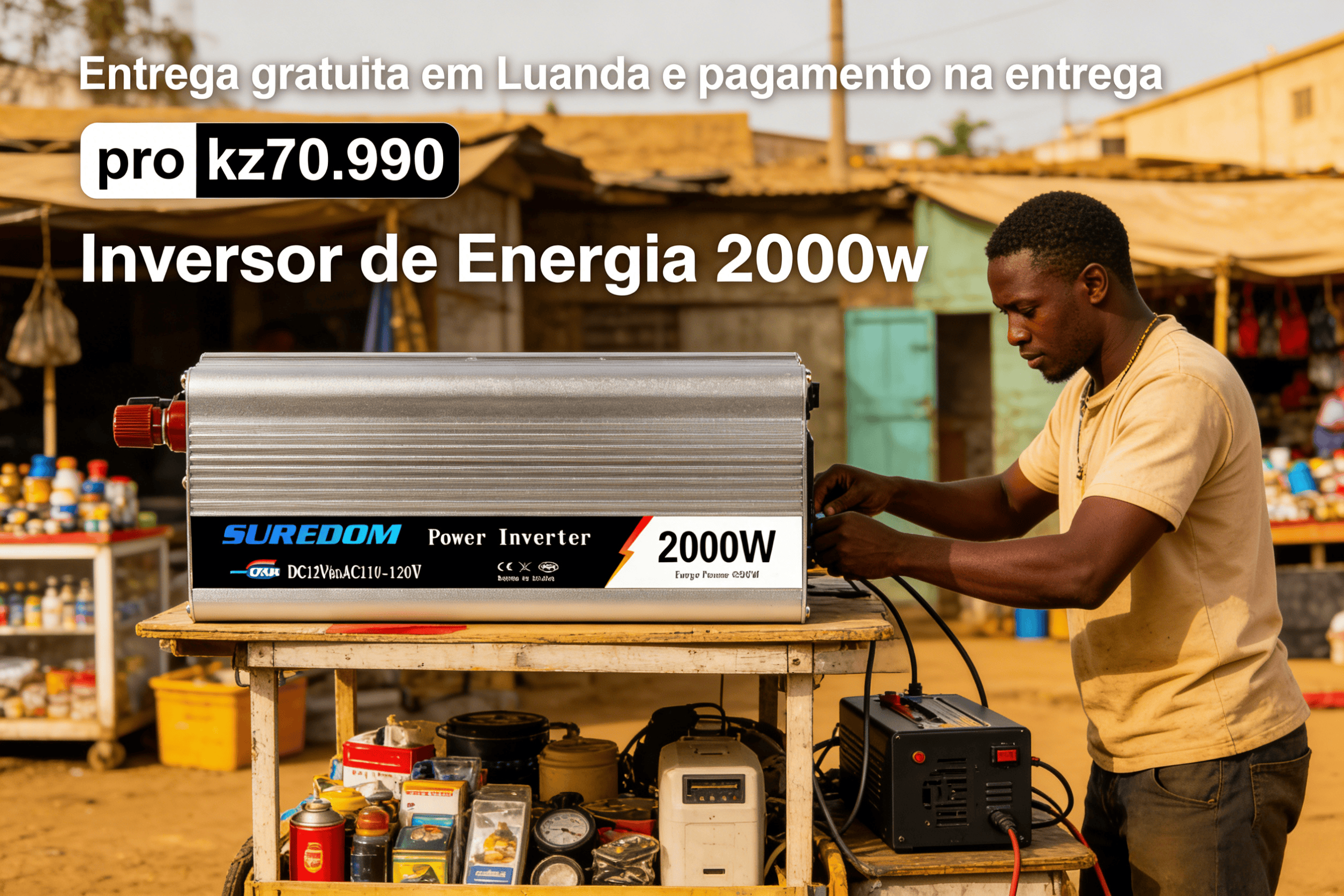 Este inversor de 2000W é a solução de energia essencial para o dia a dia angolano — ideal para quem precisa de energia estável em locais sem tomada fixa (muito comum em mercados ambulantes, viagens longas entre cidades ou momentos de lazer ao ar livre). Com capacidade de converter 12V (de bateria de veículo) para 220V/110V, ele alimenta aparelhos de maior potência (como pequenos refrigeradores, lâmpadas de mercado ou ferramentas portáteis) e conta com porta USB para carregar celulares/tablets — perfeito para adaptar-se às necessidades de comerciantes, motoristas de caminhão e entusiastas de acampamentos.