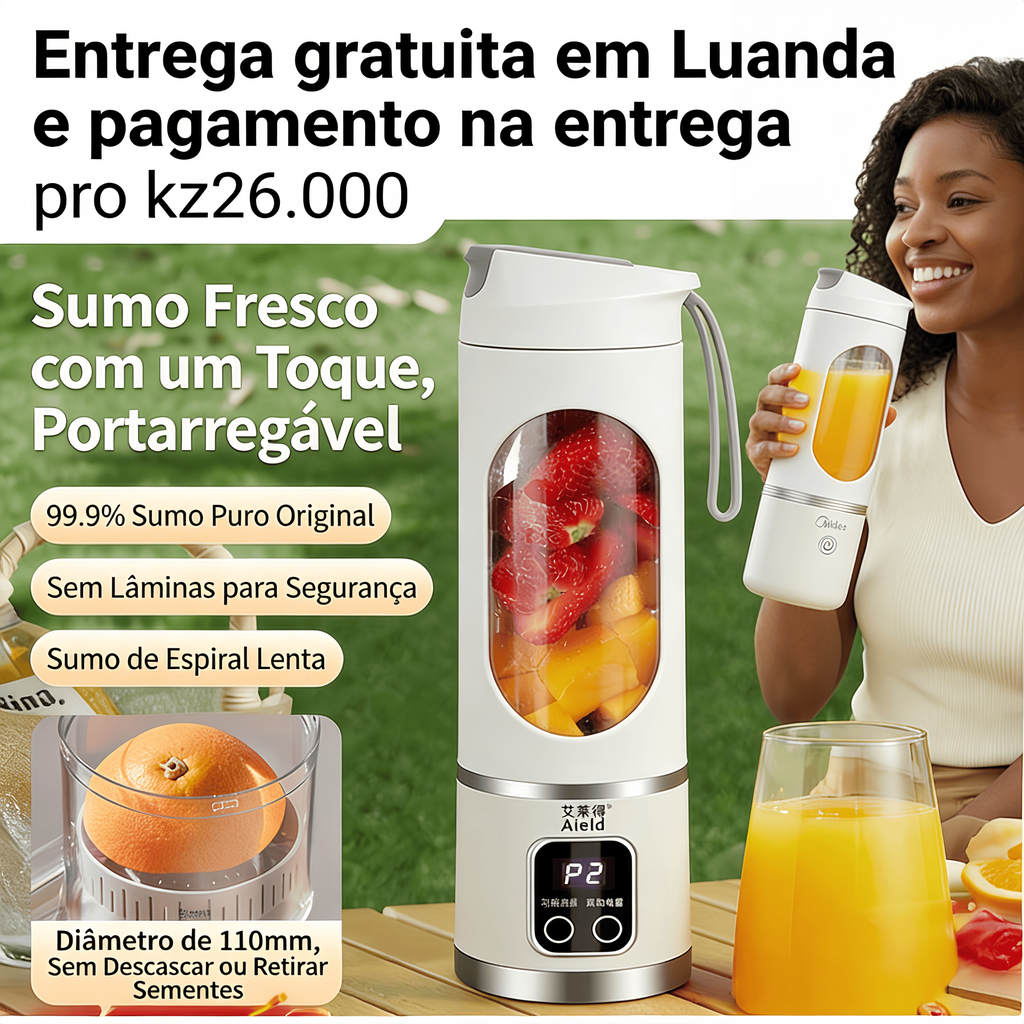 Bateria duradoura: Carrega 1 vez, serve pra fazer até 8 copos de sumo — não precisa ficar ligado na tomada o tempo todo.