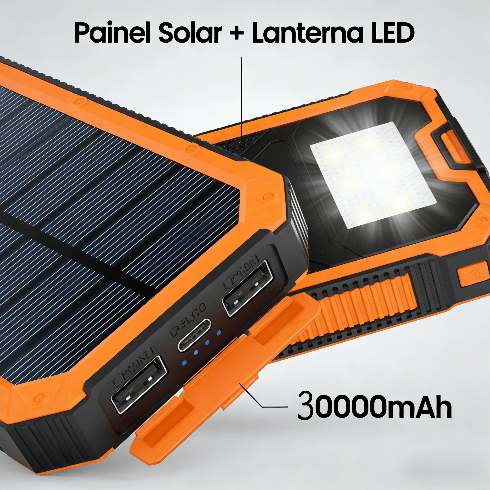 Especificações: Capacidade 30000mAh, 4 portas de saída (2 USB + 1 Type-C + 1 sem fio), painel solar, lanterna LED.